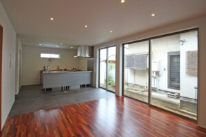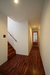 I様邸の床材には、赤みのある木材「カリン」を採用されています。廊下の奥には…