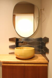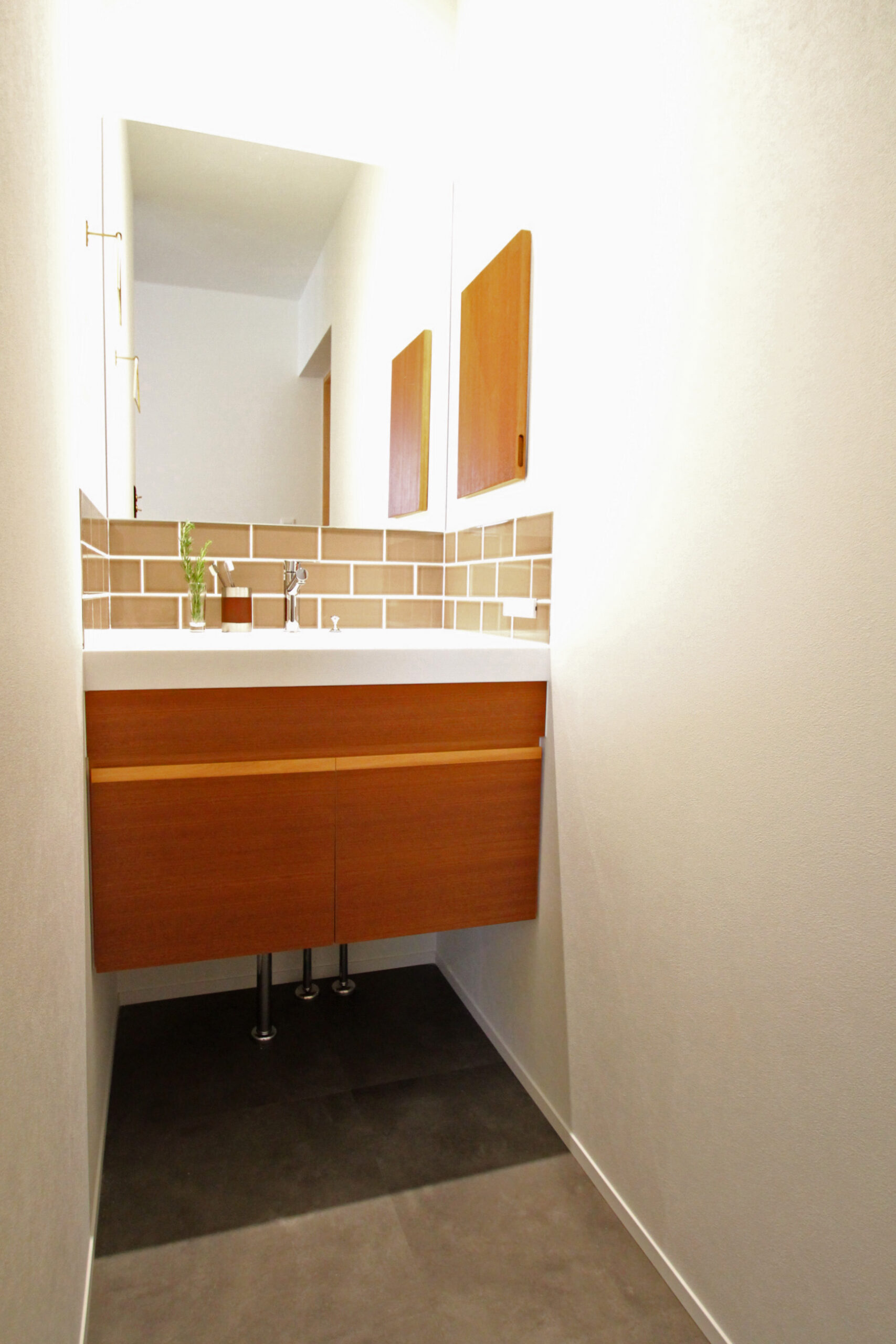 お手洗いの手洗いコーナー。鏡・タイル・ボウル・タオル掛け・カウンター…すべてがI様のお好みに仕上がるよう選ばれました👍