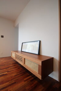 テレビボードは、一部をラタン調のデザインに。異素材を組み合わせているのも、こだわりのポイントです✨