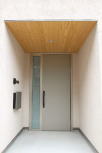 玄関ポーチの軒裏には杉板を張りました。少しの面積でも、ぐっと印象が変わりますね♪