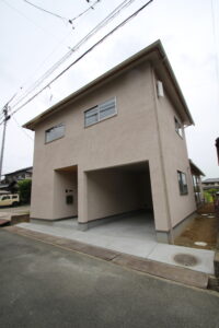 ベージュのそとん壁で仕上げた外観。ビルトインガレージがあるので、天候に左右されないのも嬉しいポイントです✨