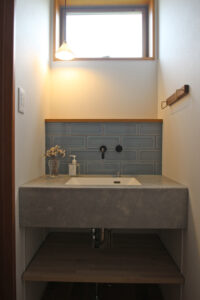 洗面です。グレーの洗面台に青色のタイルが映える、素敵な空間になっていますね✨