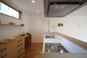 キッチンはI型を採用。向かいには造作のカップボードがあり、たくさん収納できそうです(*^^*)