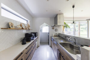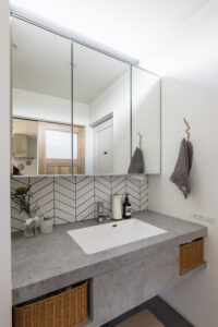 造作洗面はモルタル風にしてオシャレなのはもちろん、収納量もあって、理想的な洗面ルームです!