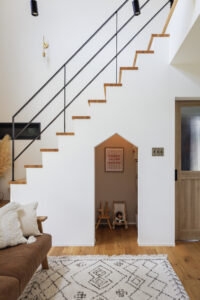 階段下は、ちょっとした収納室に。今はおもちゃを入れていて、まるでお子さんたちの秘密基地のよう✨