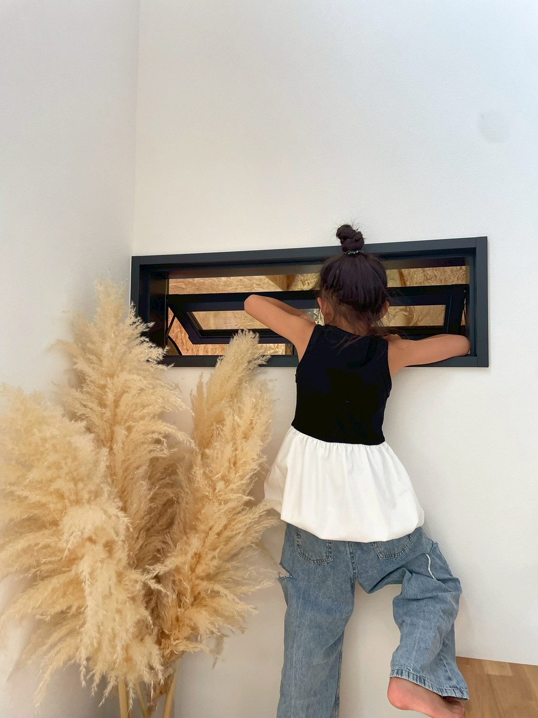 旦那さんが土間収納での撮影をしている間、リビングにある小窓から「パパがんばれ~!!」とエールを送っていました♡