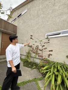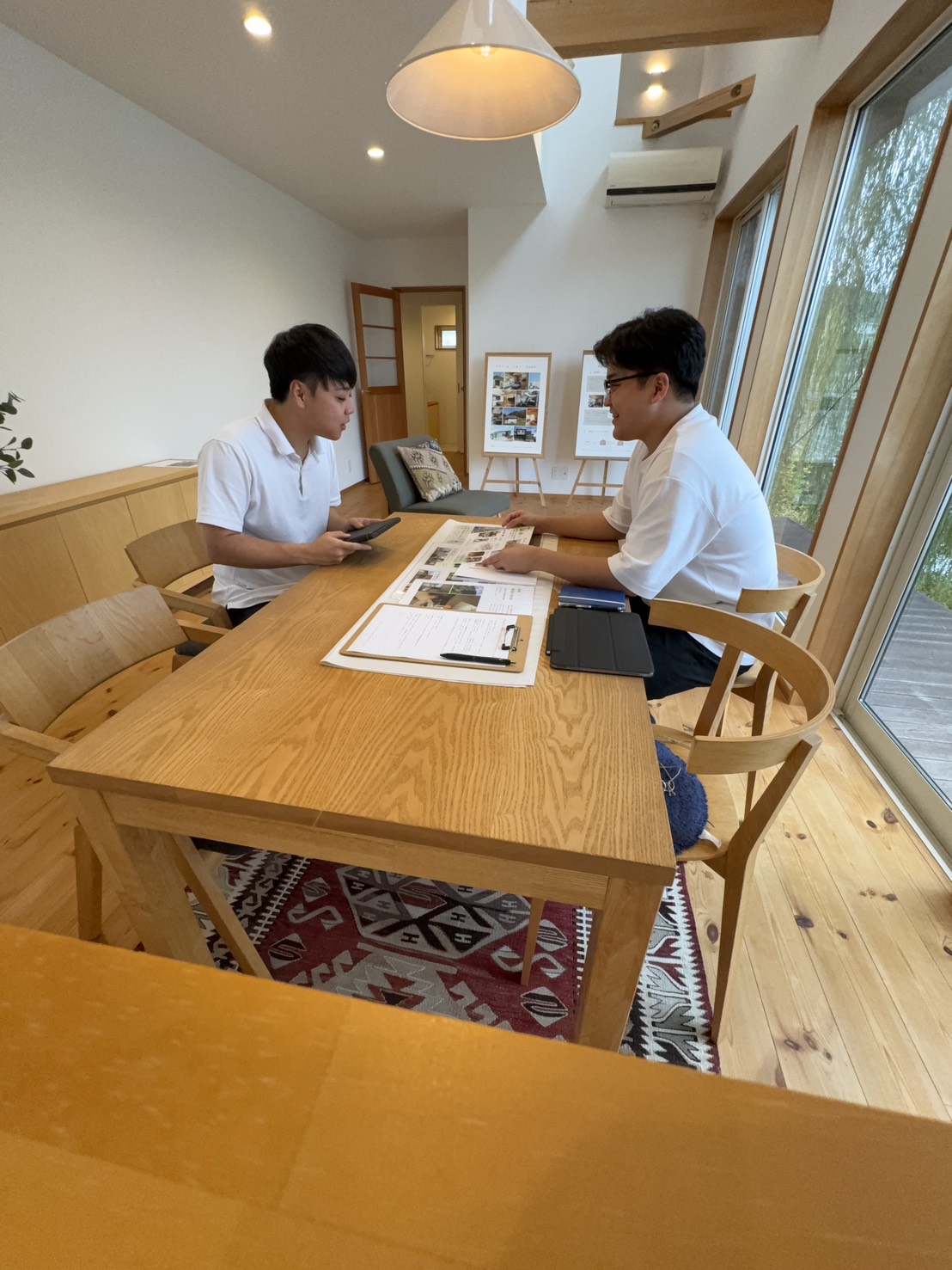 見学会でお客さんを案内できるように、モデルハウスで案内の試験をしました。