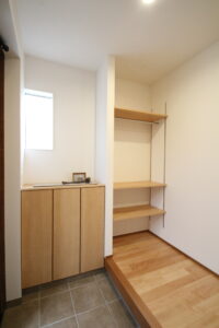 すっきりとした玄関ホールには、稼働棚を設けているので、収納を自由にアレンジできます◎