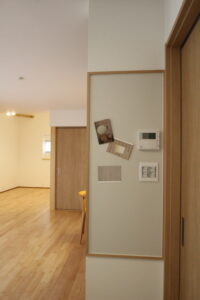 ダイニングの壁には、マグネットボードを設置。保育園や学校のお便り、レシピなどを貼るのに便利です!