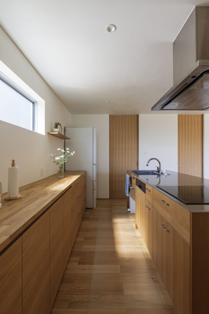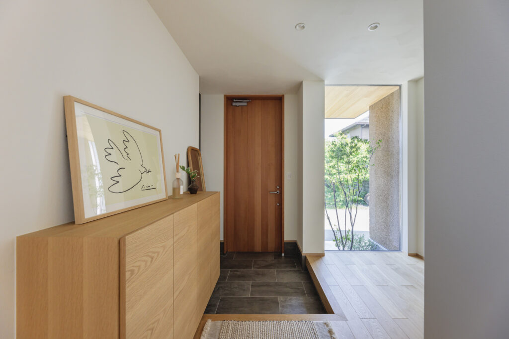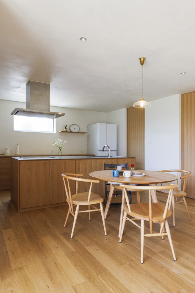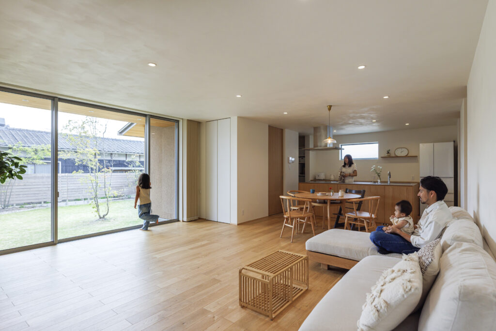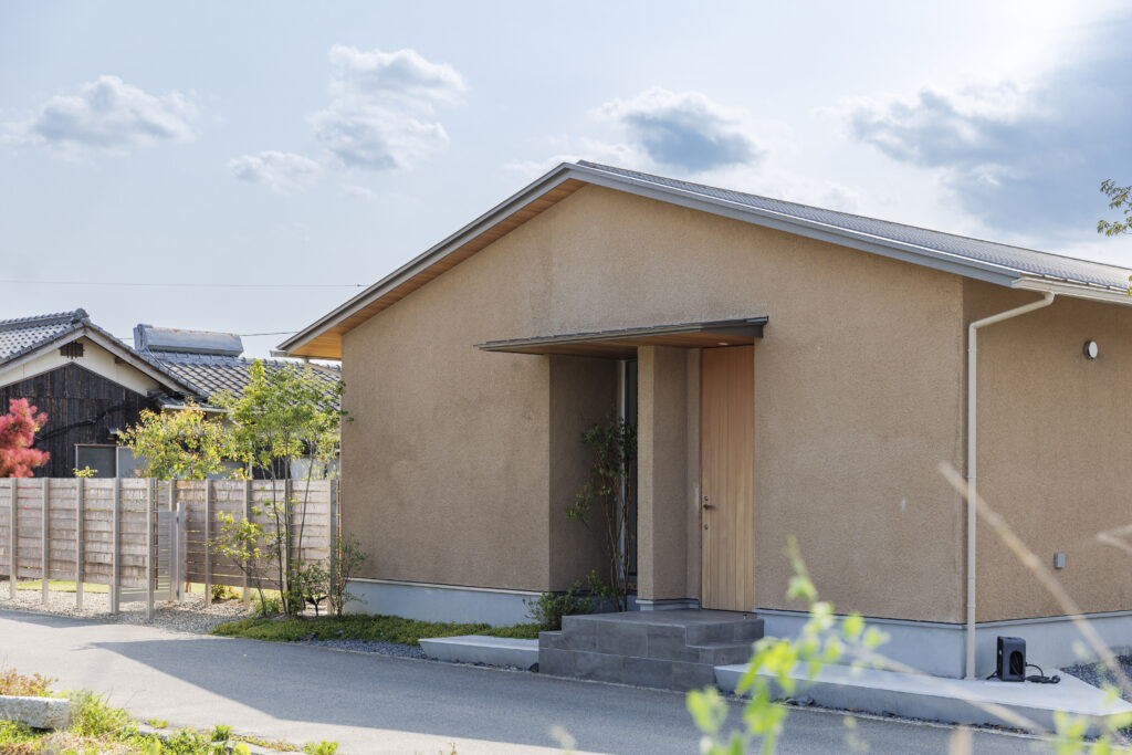 すっきりとした印象のO様邸。やさしい色味のそとん壁で仕上げた外観は、隠れ家リゾートを思わせる雰囲気です。珪藻土の塗り壁や無垢の床に映る陰影の美しさが際立つのは、お家全体がシンプルに仕上げられているからこそ。ほっと優しくて、どこか品のある雰囲気が、O様ファミリーにぴったりです。