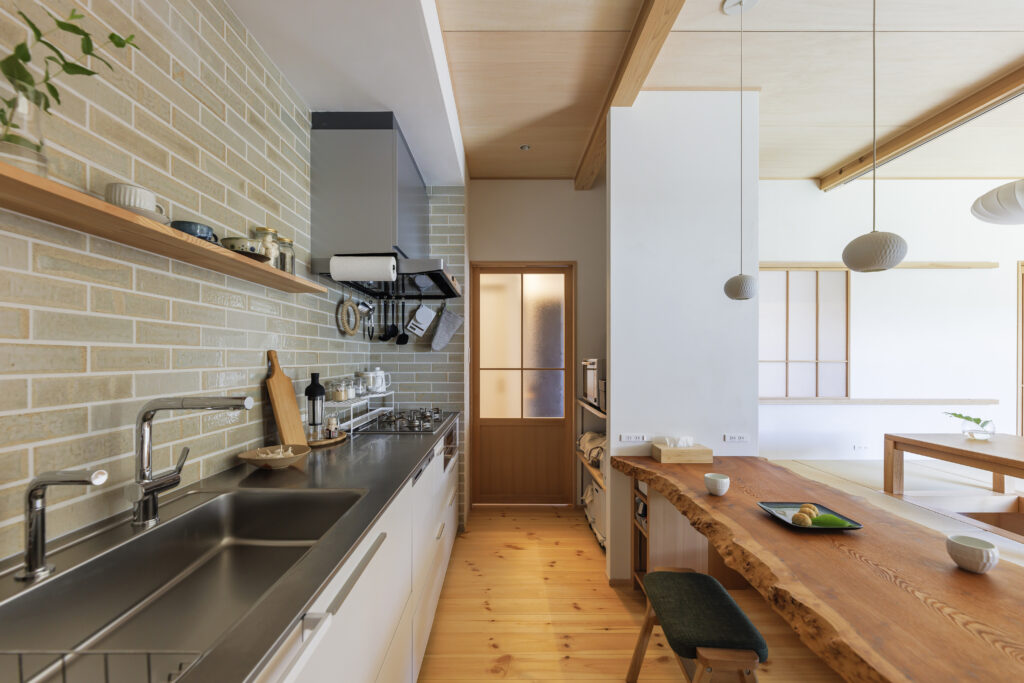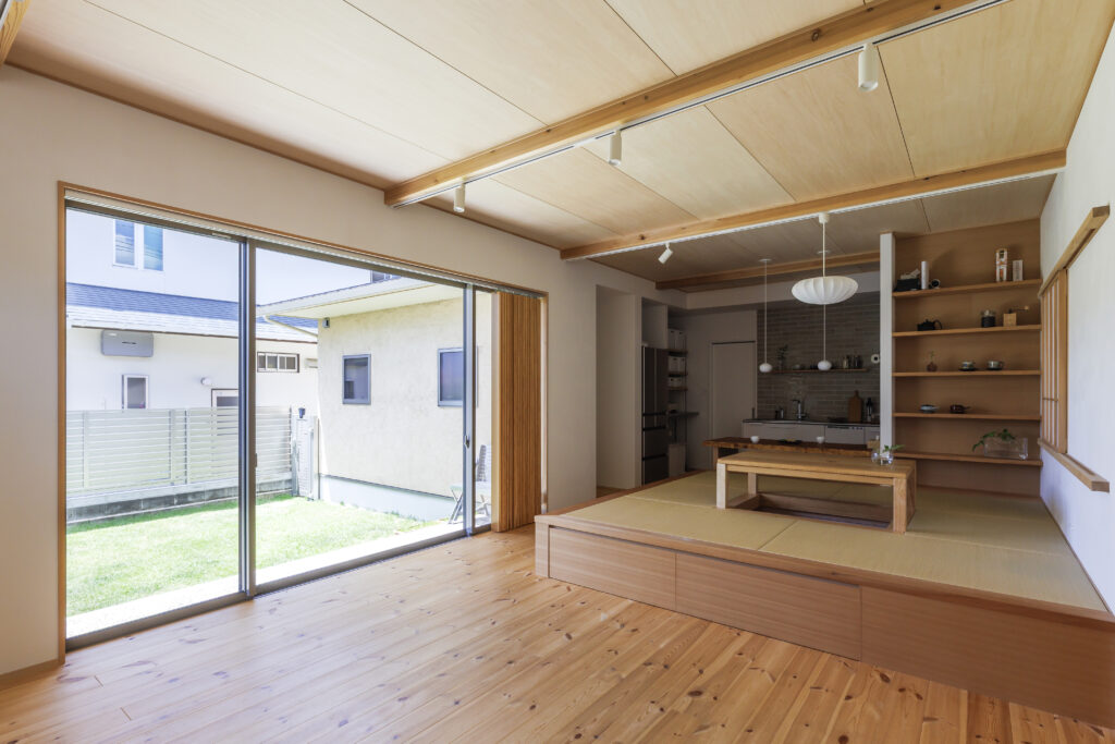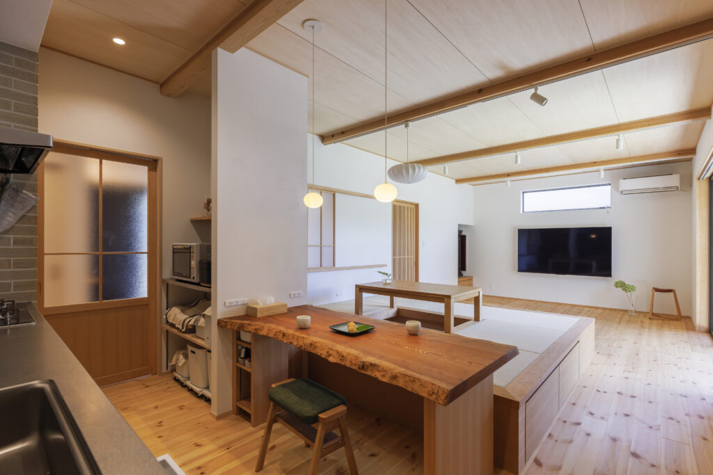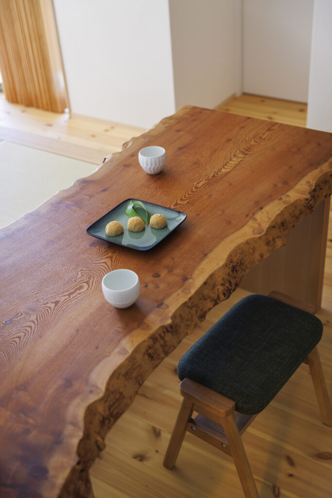 やさしい空気を纏うH様邸は、和風の平屋のお家。玄関前にある植栽を眺めながらお家に入ると、自然素材のやわらかな香りに包まれます。堀座卓のあるLDKや耳付きの無垢板カウンターなど、見どころ満載。また、気密や断熱性だけに注目するのではなく、自然が生み出す清々しさを取り入れて快適に暮らすことも、H様が大切にしたポイントです。珪藻土や無垢材をたっぷり使ったり、風通しを考えた間取りにもこだわりが。自然が与えてくれる心地よさを、五感で感じられる癒しのお家が完成しました。