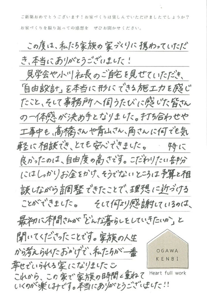 この度は、私たち家族の家づくりに携わっていただき、本当にありがとうございました!見学会や小川社長のご自宅を見せていただき、「自由設計」を本当に形にできる施工力を感じたこと、そして事務所へ伺うたびに感じた皆さんの一体感が決め手となりました。打合せや工事中も、髙橋さんや青山さん、角さんに何でも気軽に相談でき、とても安心できました。特に良かったのは、自由度の高さです。こだわりたい部分にはしっかりお金をかけ、そうでないところは予算と相談しながら調整できたことで、理想に近づけることができました。そして何より感謝しているのは、最初に本間さんが「どんな暮らしをしていきたいか」と聞いてくださったことです。家族の人生から考えられたおかげで、私たちが一番幸せでいられる家になりました☺これから、この家で家族の時間を重ねていくのが楽しみです。本当にありがとうございました!!