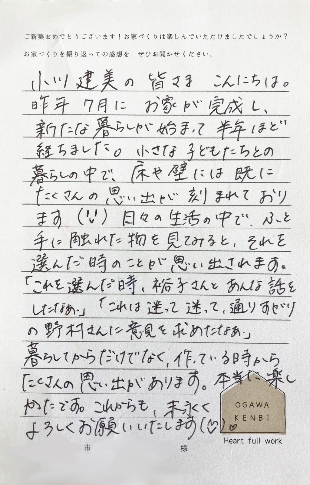 小川建美の皆さま、こんにちは。昨年7月にお家が完成し、新たな暮らしが始まって半年ほど経ちました。小さな子どもたちとの暮らしの中で、床や壁にはすでにたくさんの思い出が刻まれております☺日々の生活の中で、ふと手に触れた物を見てみると、それを選んだ時のことが思い出されます。「これを選んだ時、裕子さんとあんな話をしたなぁ」「これは迷って迷って、通りすがりの野村さんに意見を求めたなぁ」。暮らしてからだけでなく、作っている時からたくさんの思い出があります。本当に楽しかったです。これからも、末永くよろしくお願いいたします☺♡